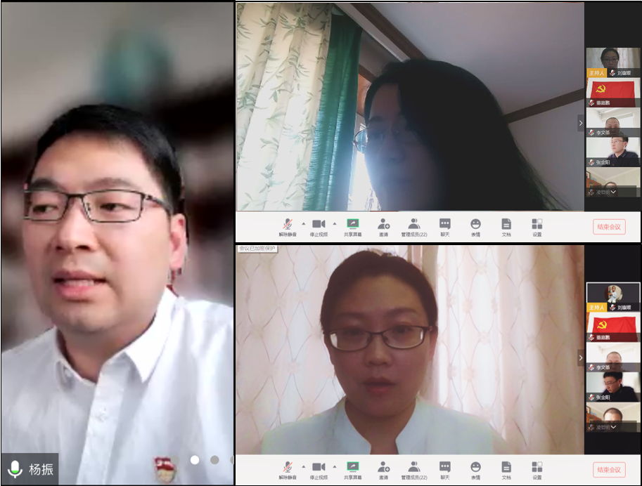 杨振号召支部党员们,作为学校教职工党员,要按照学校党委和机关党委要求,将疫情危机转化为学校教育教学发展的契机,提高政治站位,主动适应党务业务工作从“传统”“线下”向“创新”“线上”转型的变化,为学校疫情防控和事业发展汇聚力量。