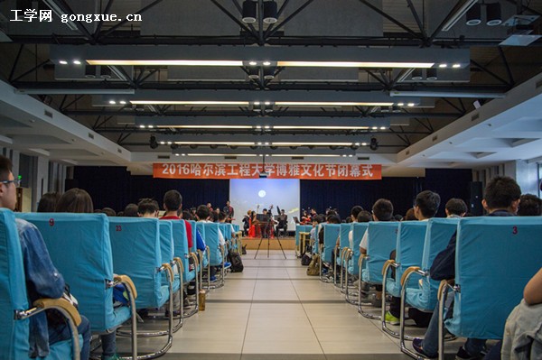 闭幕式上,表彰了各类活动的获奖选手,并遴选部分优秀作品在现场进行展示。“趁东风,秀纸鸢”——博雅风筝大赛的原创优秀作品,与古诗相结合,逐一展示于舞台前;演讲比赛的亚军尹珍元身着跆拳道服,娓娓道来跆拳道对于她的生活的改变;赴清华大学参加人文知识竞赛的冯洪超同学,分享自己参赛的所见所闻;一曲哈工程版的《南山南》,用歌声、歌词,把大学四年对母校的不舍之情,描绘地淋漓尽致。