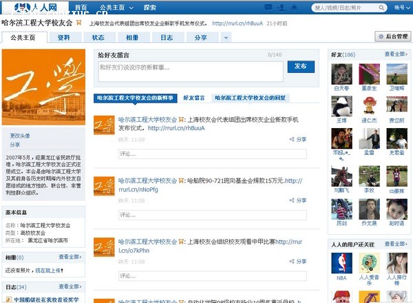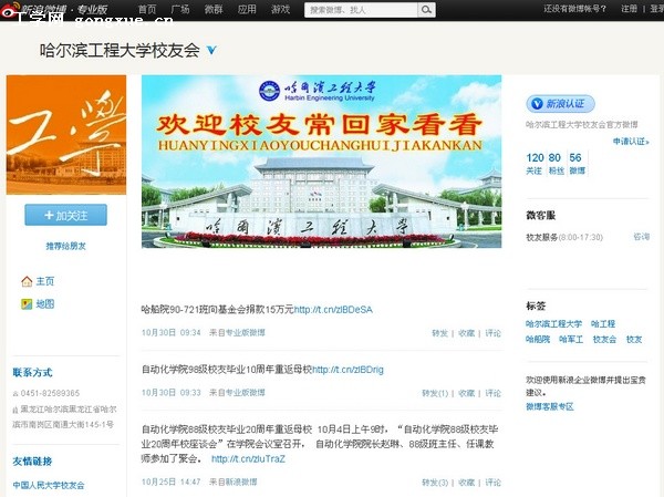 10月26日,哈尔滨工程大学校友会官方新浪微博及人人网公共主页分别通过其网站认证并开始试运行。自此,除工学校友网(http://www.heu.org.cn)外,学校校友工作增加了两个面向海内外及在校生的网络宣传与推广平台。