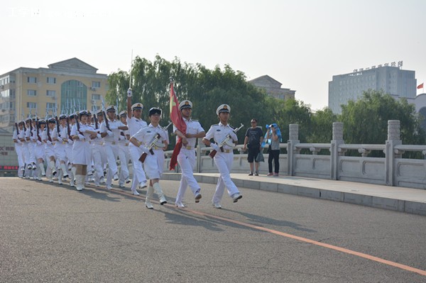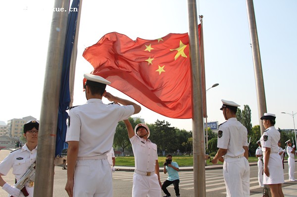 伴着慷慨激昂的《歌唱祖国》音乐声,由国防学院毕业生组成的国旗护卫队迈着整齐矫健的步伐入场,在庄严的国歌声中五星红旗冉冉升起。我校毕业生代表张以恒发言,代表2015届毕业生表达了他们对老师的感谢和敬意,对母校的眷恋,以及对走出校门、踏上未来征程的憧憬与喜悦。