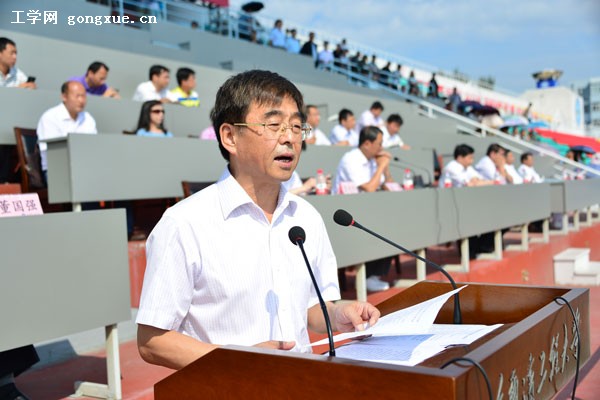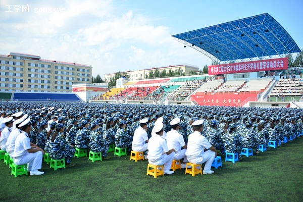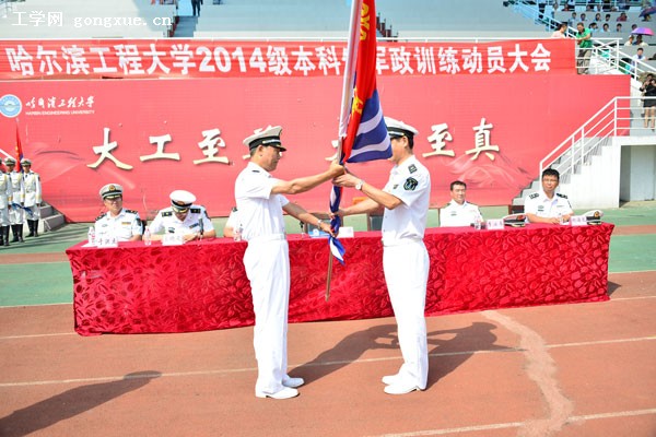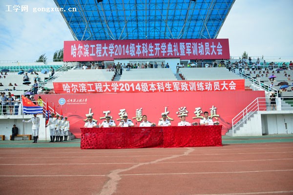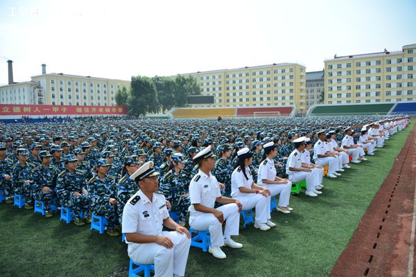 17日上午,2014级本科生开学典礼暨军训动员大会在北体育场举行。校长刘志刚,校党委副书记高晚欣,军训团第一政治委员、校党委副书记、副校长魏潾,副校长杨德森、夏桂华、杨冶,校长助理董国强,海军驻校选培办主任李汝亭上校出席典礼并在主席台就座。