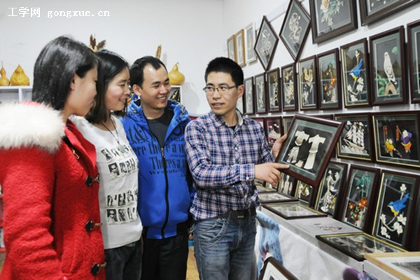 我校发动机专业硕士研究生刘春罡选修赫哲族鱼皮画制作技艺课程后,看准传承非物质文化遗产蕴含的商机,在2013年8月创办哈尔滨福鱼文化传播有限公司,专门经营学生社团鱼皮画协会会员们的作品,传播鱼皮画艺术。短短几个月,公司就实现营业收入20余万元,还为3名聋哑人创造了自食其力的就业机会。图为日前刘春罡与同学在学校免费提供的工作间研讨作品创作。