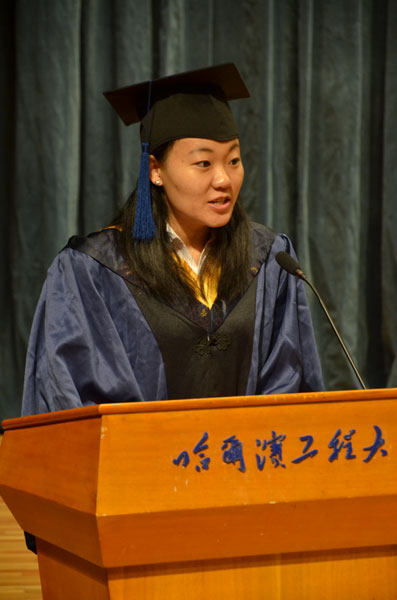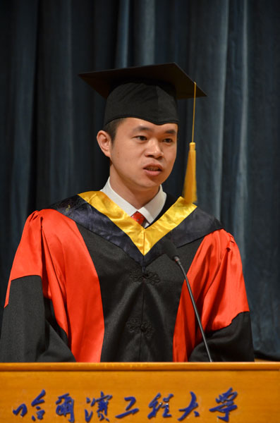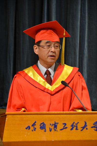 “个人的梦想与‘中国梦’是同在共存、共同实现的”,校长刘志刚在典礼上寄语毕业生。他向顺利完成学业的研究生学子们表示祝贺,并提出三点希望:一是敢于拥有梦想。要在平凡的日常工作生活中始终拥有梦想。“有梦想才有成功的希望、不懈的动力,有梦想就能拥抱明天、就有无限可能”。二是执着追求梦想的实现。要保持充满好奇、探索究竟的态度,耐住寂寞、沉下心来的心境,要有持之以恒、水滴石穿的精神,脚踏实地、务实肯干的行动,和乐观向上、豁达开阔的心胸,正确看待一时的得失、正确对待人生中的各种经历。三是梦想应有正确的方向。把个人的梦想追求有机融入“中国梦”的实现,将个人的发展与国家利益、社会责任紧密相连,继承60年来哈军工人、哈船院人、哈工程人忠诚坚韧、追求卓越的血脉。敢当重任、可堪大用,为“中国梦”的实现贡献自己的一份力量。他最后祝毕业生们追求卓越、梦想成真。