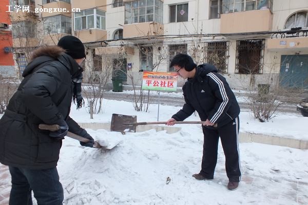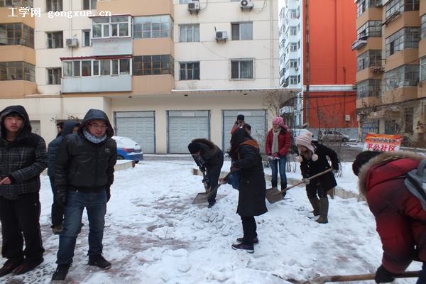 2012年12月26日,为了进一步建设校园文明,提升学校声誉,由理学院团学工委主办的社区服务行动继续进行中。由于哈市今年冬天降雪频繁,清理积雪缺少人手,给市民的日常生活带来了不便。理学院团学工委以此为基点,迅速组织相关人员协助社区清雪。