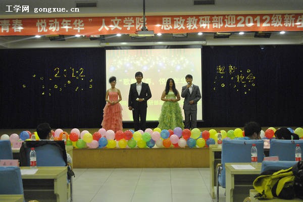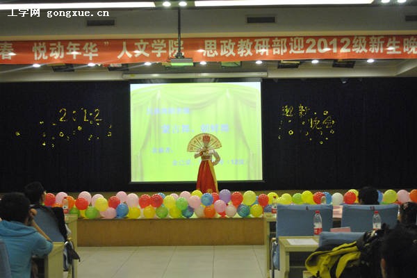 9月26日 晚6点半,人文学院和思政部在启航活动中心多功能厅举办“歌舞青春,悦动年华”2012级迎新晚会。出席晚会的嘉宾有人文学院党委副书记刘振宇,思政教研部2012级学工办主任吴岚,人文学院学生会秘书长兼辅导员金璐璐,人文学院、思政部2012级新生所在班级的班主任和其他院系的团委副书记、学生会主席等。