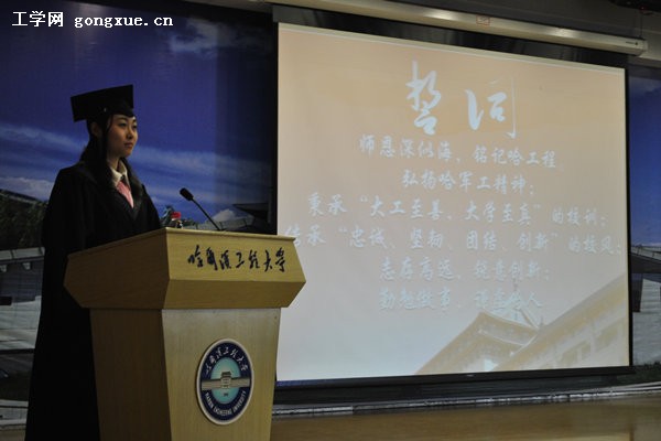 进入“勤勉奋进志”部分,由黑龙江省优秀毕业生薛梦溪带领所有毕业生进行诚信宣誓,他们承诺将秉承“大工至善,大学至真”的校训和“忠诚、坚韧、团结、创新”的校风,继续弘扬军工传统和勤勉奋进之志。