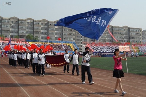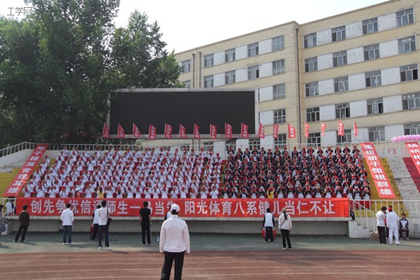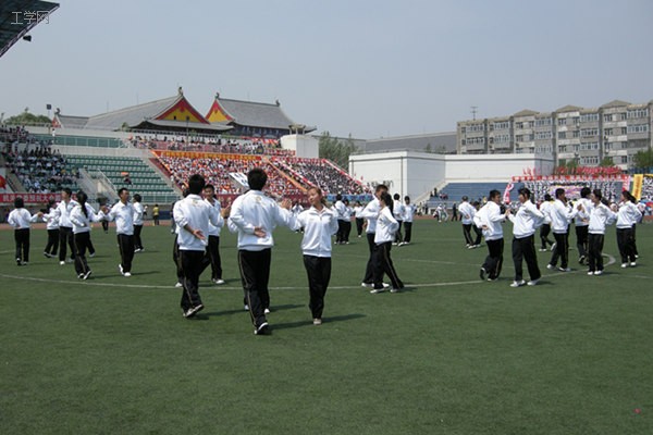信通学院全体学生穿戴整齐,伴着锣鼓声,在观众席上表演集体徒手操,动作整齐,展现了信通学院良好的精神风貌。