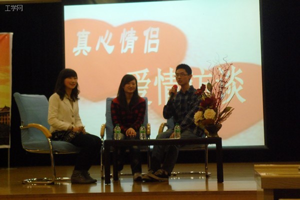 讲坛开始前,工作人员为大家播放了一段关于校园爱情的DV短片,并邀请一对情侣上台分享他们恋爱的经验。