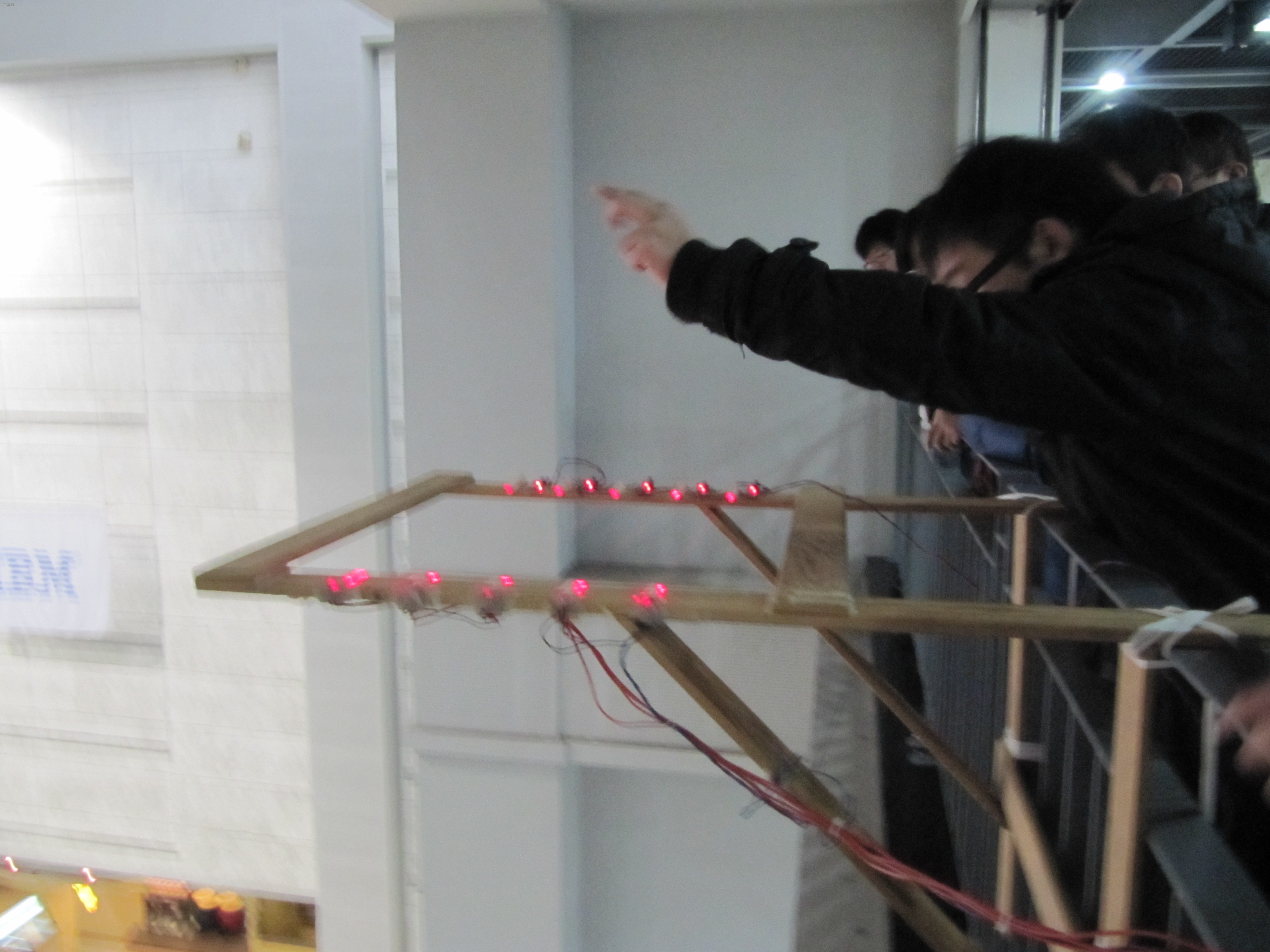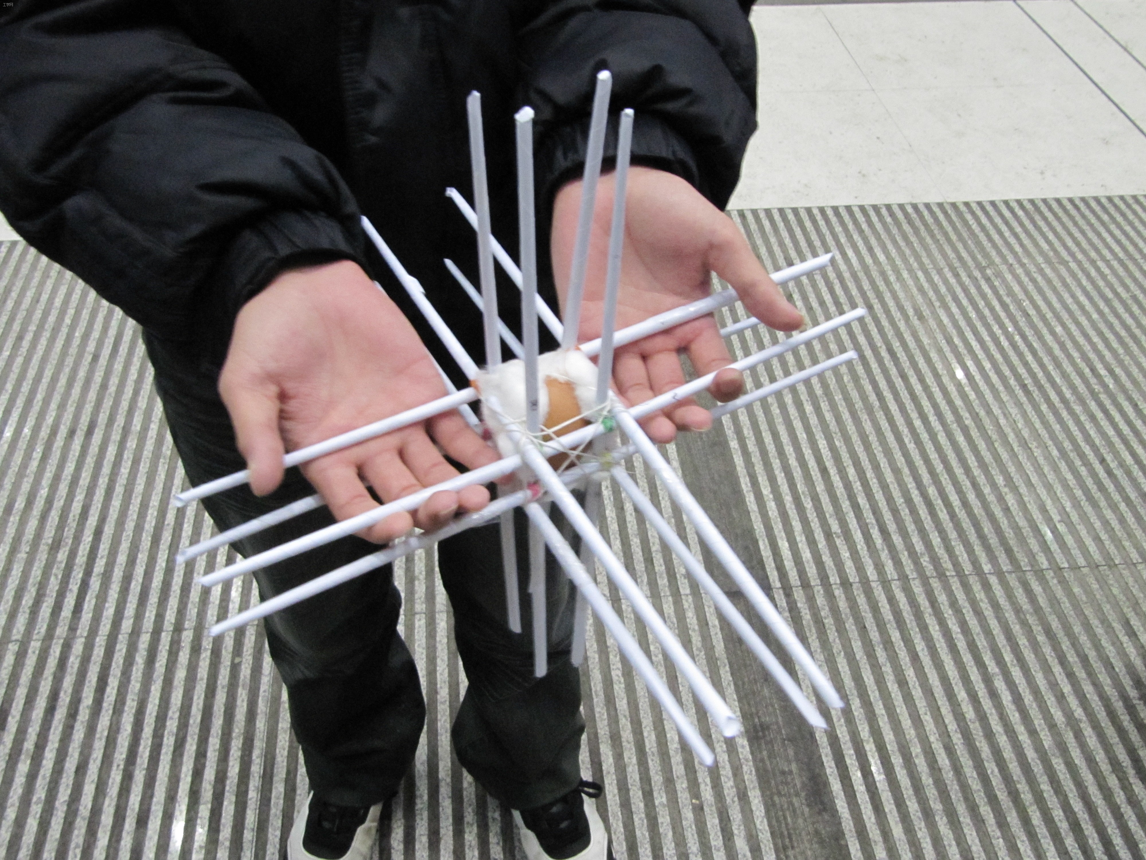 比赛前,选手的作品便陆续亮相。选手们的作品花样繁多,有的利用筷子作为支架搭成一个坚固的四面体结构,有的利用气球把鸡蛋包裹住成为葡萄的样子,有的给鸡蛋挂上一个伞包,让鸡蛋做“航空兵”……同学们丰富的想象力为此次比赛增添了一道道靓丽的风景。