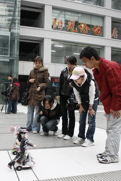 展览现场,舞蹈机器人——迈克尔杰克逊、向日葵机器人、智能小车、六足昆虫爬行机器人、水下采矿机器人、助行机器人等众多学生科技创新作品吸引了参观同学的目光。