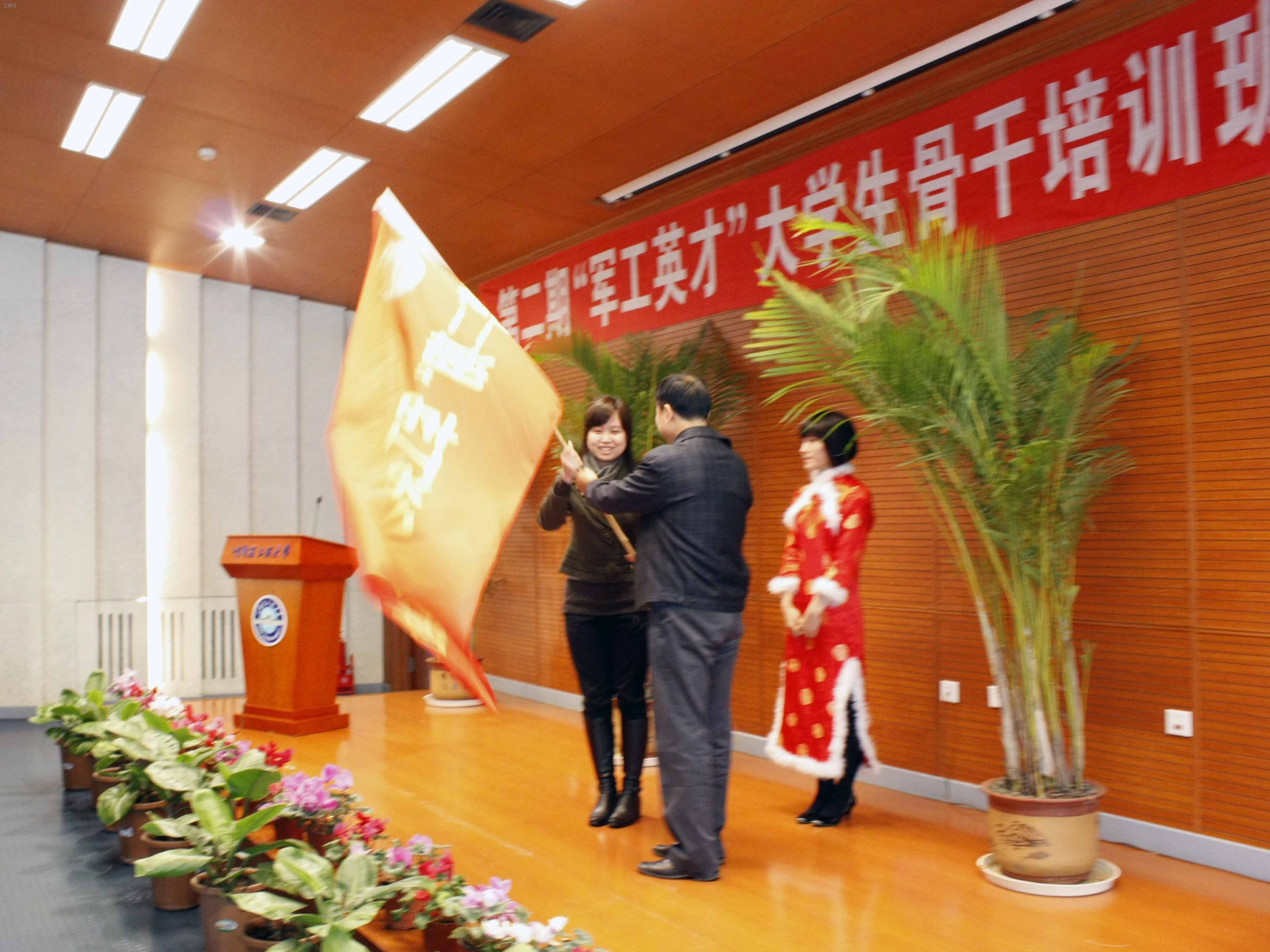校党委副书记、副校长魏潾为学员代表授旗并讲话。他指出,“军工英才”大学生骨干培训班是我校秉承“精英教育”的治学理念,贯彻“创新推动、打造品牌”的人才培养战略,为创建高水平研究型大学,提高人才培养质量,构建精英教育体系而实行的一项重要举措。培训班学员应珍惜培训机会,提高自己的综合素质和实践能力,成为我国中国特色社会主义事业合格的建设者和可靠的接班人。