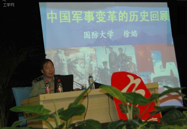 徐少将首先指出,新时期中国面临很大机遇,中国需要军事变革。同时引述了胡锦涛主席“全面建设小康社会,实现富国和强军的统一”的科学论断,从4个方面对中国的军事变革进行了阐述。一是能否抓住机遇决定着国家的兴衰,二是中国在每次机遇面前的表现,三是正确认识世界形势和制定国家战略,最后是历史的经验和反思。他说,中国要发扬自身优点,继承优秀的文化积淀。部队建设要走一边机械化、一边信息化的跨越式发展道路,要建立持续的军事工业,加强产业结构调整,走经济与防务相结合的路线。