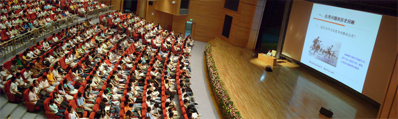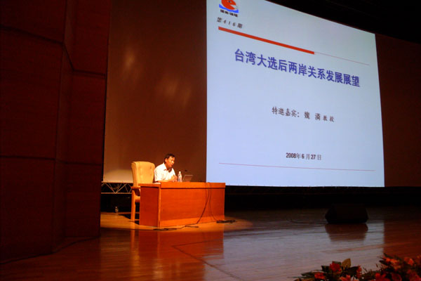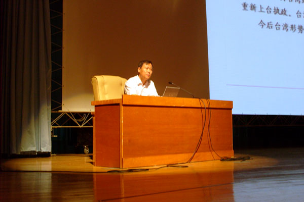 他首先从台湾问题的历史出发,回顾了台湾问题形成的原因,并就大陆、台湾、美国之间的利益问题进行了深入的阐述。随后,他从“反‘台独’斗争的基本过程”、“如何看待台湾的选举”、“两岸关系的发展趋势展望”三个方面,讲述了我国几代领导人对台问题的努力。同时,他就现在的“保钓”问题和同学们交流了自己的看法。