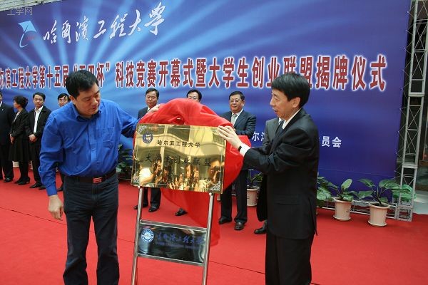 校党委书记谷焕民、南岗区委书记张惠涛为大学生创业联盟揭牌。