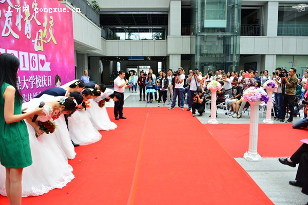 八位新人在师生的瞩目下交换结婚信物,接受师弟师妹们送上的鲜花与问候。