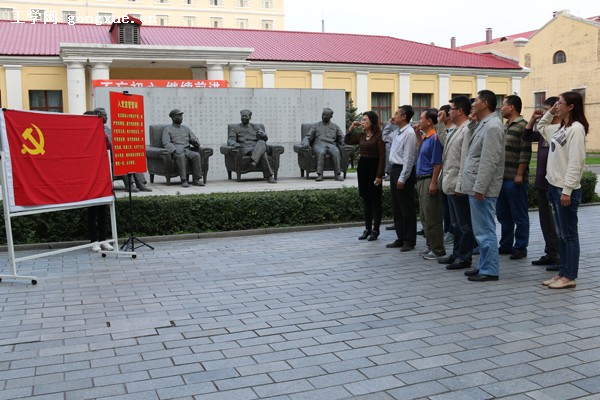 离退休处党支部全体党员在受命群雕像前,面对党旗,胸戴党徽,一起重温入党誓词,党员们表示将尽职尽责,为老同志做好事、办实事、解难事,继续为学校发展做出应有贡献。