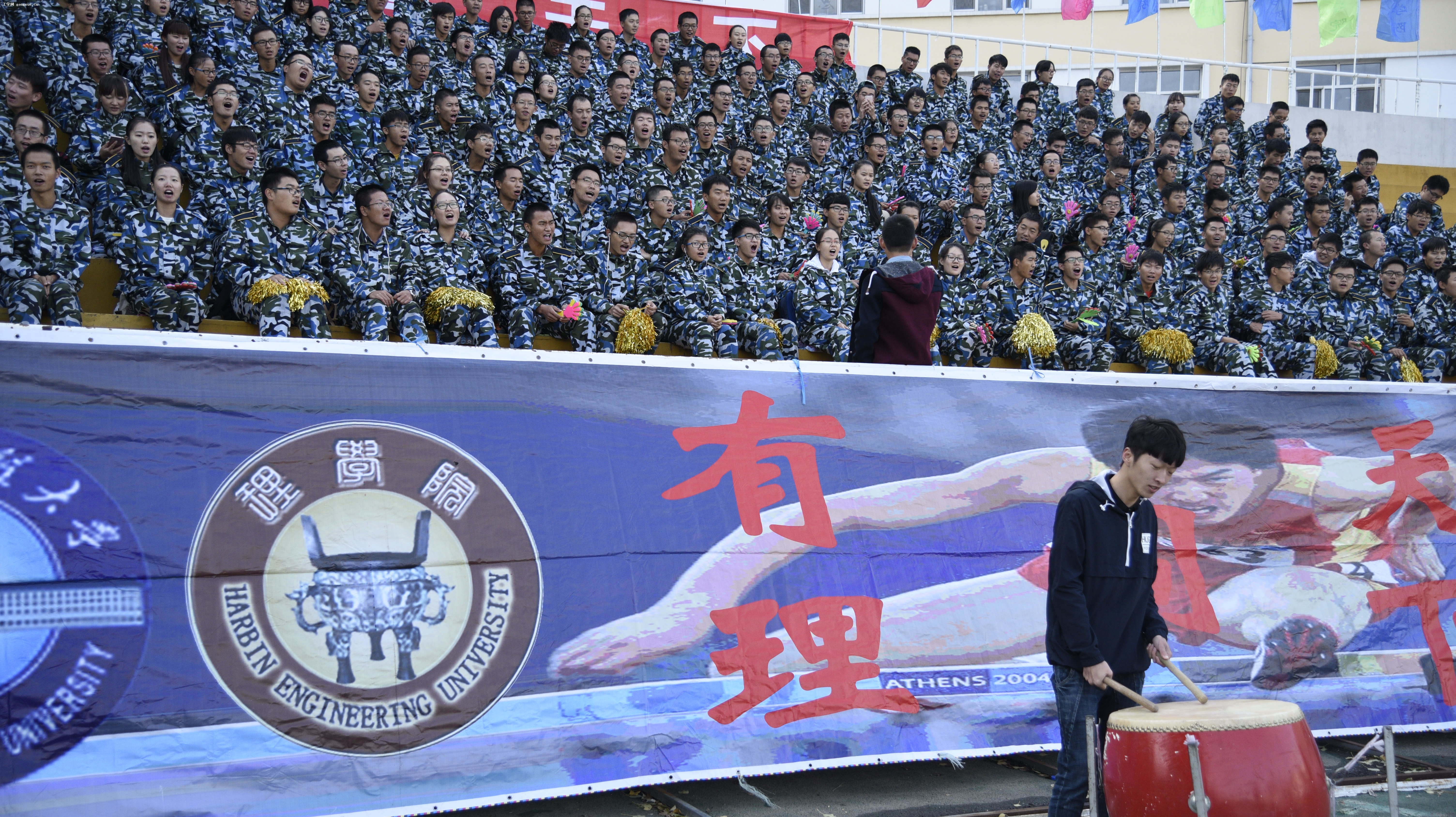九月下旬的哈尔滨天气已经转凉,丝丝寒意透过他们单薄的军训服,入侵他们的肌骨,但是丝毫不能冷却他们心中的热情。运动员在赛场拼搏,他们在观众席上战斗。比赛准时开始,他们高声呐喊助威,呼声一层高过一层,激烈的程度丝毫不逊色于赛场上。他们的加油鼓舞,振奋了赛场上每一位运动员,让运动员们拼出自己最好的成绩。