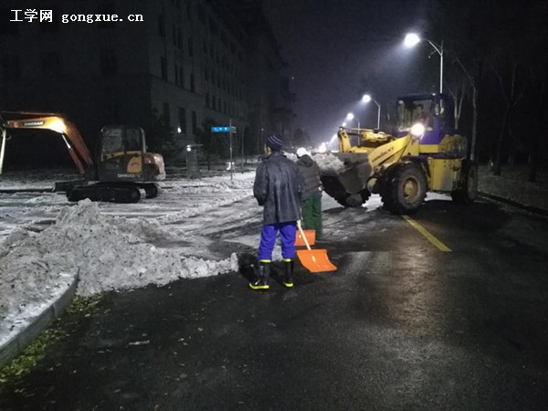 后勤集团绿化中心承担着校园主干道的清雪任务,雪情即是命令,绿化中心员工分秒必争,全员奋战在清冰雪一线。在前期完成校园主干道清雪任务的基础上,为了让全校师生有一个安全的出行环境,绿化中心主动承担起学生分担区内人员密集出行区域的清雪任务。11月13日,后勤集团出动了16台挖掘机,3台装卸机,50余人连续奋战20余小时,直到14日凌晨,员工们依然顶着风雪雨水奋战在清雪工作中。