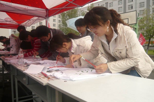 虽然下着蒙蒙细雨,但同学们参与活动的热情却丝毫不减。一块块朴实无华的陶泥,一件件平凡无奇的白T恤,在同学们巧手与创意的结合下,尽显青春与风采。憨态可掬的维尼熊,惟妙惟肖的小猪,灵动飘逸的野猫,还有豪放不羁的涂鸦……其中最多的就是以抗震救灾与北京奥运为主题的作品,为远在四川的灾民送上了一份真诚的祝福。