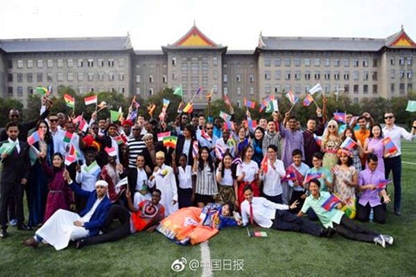6月17日,我校45国百余名外国毕业生手持本国国旗,身着民族特色盛装,共同摆出了“一带一路”缩写字母“B&R”,拍下创意毕业照。
