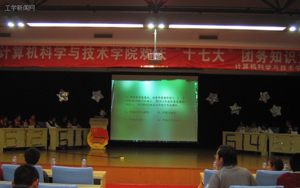 计算机学院团委于11月1日晚在启航活动中心四楼多功能厅举办欢庆“十七大”团务知识竞赛活动,以庆祝“十七大”的闭幕。学校各院系团委副书记出席了此次活动。