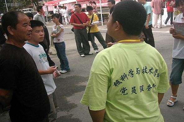 8月21日,是迎新的第三天,也是核科学与技术学院的党员服务队为2007级新生服务的第三天。三天来,这支由学院二十余名党员自愿组成的服务队,轮流值班,在紧张忙碌的迎新现场帮助保洁人员维持场地卫生,为新生和新生家长提供咨询服务,帮助新生抬行李,主动帮助家长联系旅店和购买火车票等,积极践行党员的先锋模范作用。