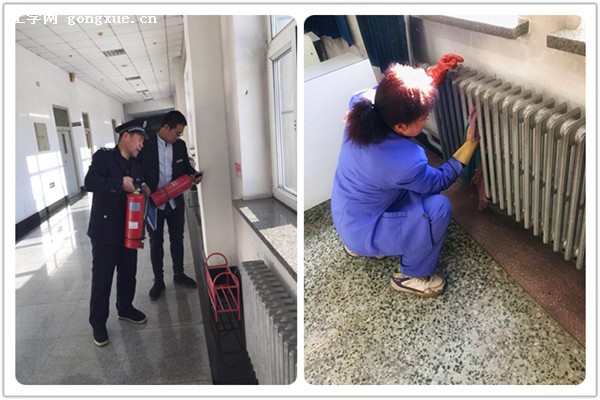 管理员与门卫进行消防检查,保洁人员清理暖气灰尘
