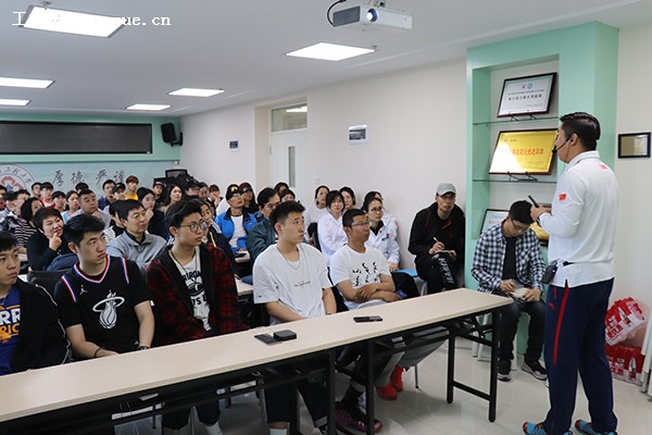 讲座通过“什么是MTT(运动医疗康复)”、“脊柱运动恢复”和“再生与恢复”三个部分详细讲述脊柱运动康复。黄鑫首先讲解了在德国运动康复的概念及四个流程:住院式MTT康复医院或中心、门诊式MTT康复中心、MTT社区康复工作室、健身中心的MTTF康复。他还对脊柱肌肉的检查评估及训练情况进行了介绍,通过视频、图片及互动的形式向师生介绍肌肉分类、分布及相应锻炼方式,并给同学们提供稳定训练顺序及四阶段医学运动康复处方。黄鑫指出,日常生活的身体姿态对脊柱的影响很大,在工作和学习中要尤为注意。并向与会师生介绍了一些简单高效的训练动作及器械辅助训练方法。