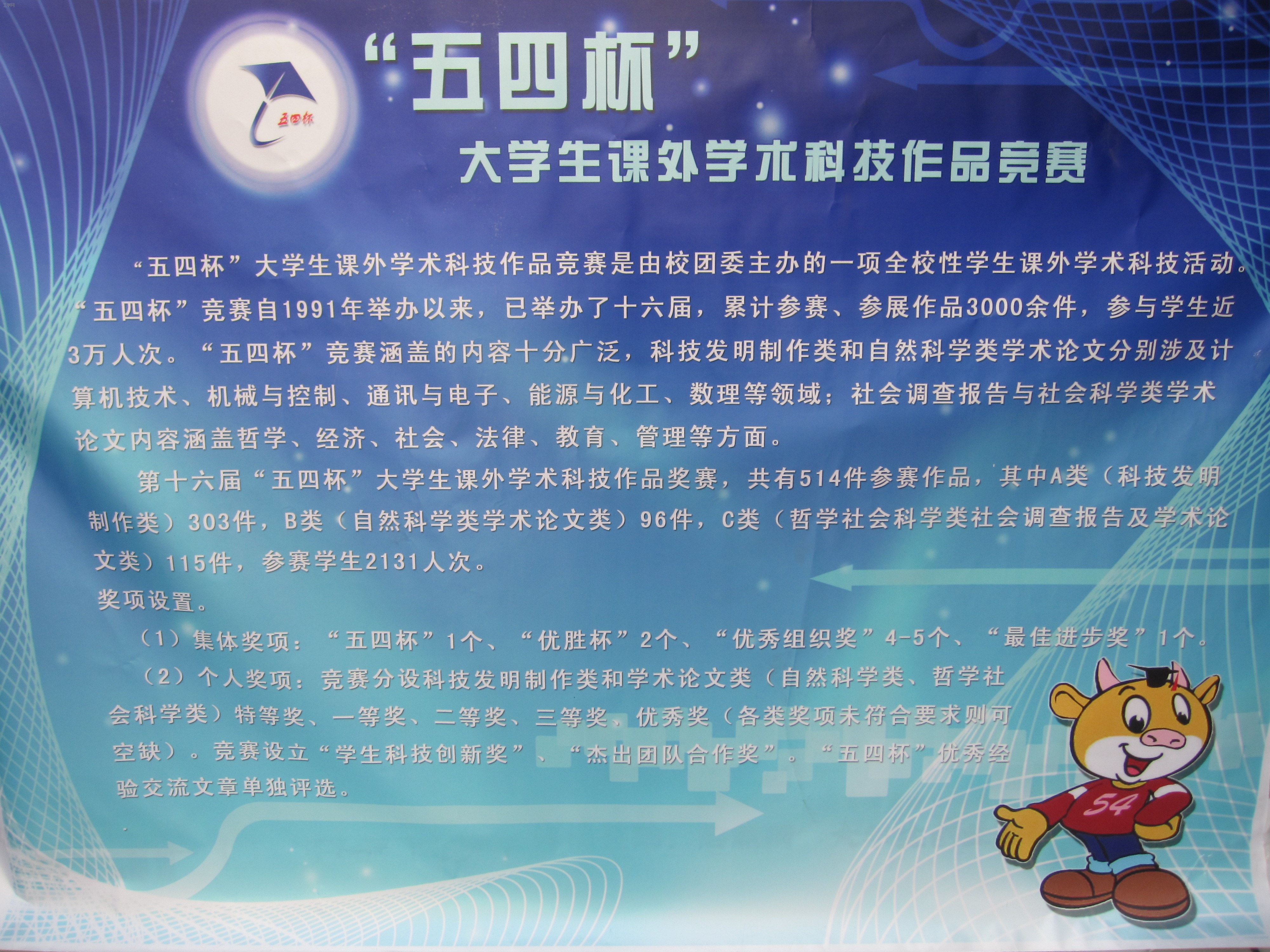 5月15日,第十六届“五四杯” 博爱科技学术科技作品竞赛在启航活动中心阳光大厅拉开帷幕。我校自1991年开始举办第一届“五四杯”大学生课外学术科技作品竞赛,“五四杯”以其独特的魅力吸引着我校大批热爱科技创新的青年学生,引领了我校“一院多品”的特色工作体系,为科技创新人才提供了重要的舞台。今年又是一次科技的盛会,又是科技与创新魅力的展现。在阳光大厅的每个站台中都散发出科技的光环,闪烁出创新的光芒。