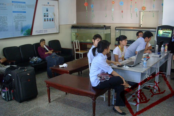 大厅里工作人员高效在为新生办理入住手续,并且为等候的家长提供休息在地方