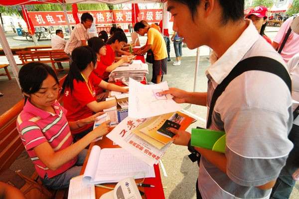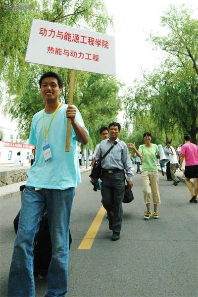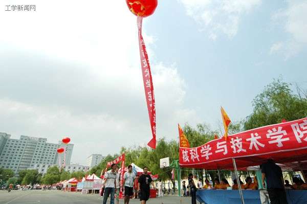 跟着我们走!我们带您去报到! 二公寓门前的操场上,往日激烈的篮球赛今天销声匿迹了,取而代之的是一片热火朝天的迎新场面!让我们去找找我们的学院,我们的家!“好了,手续办齐了,你可以去领服装了!”