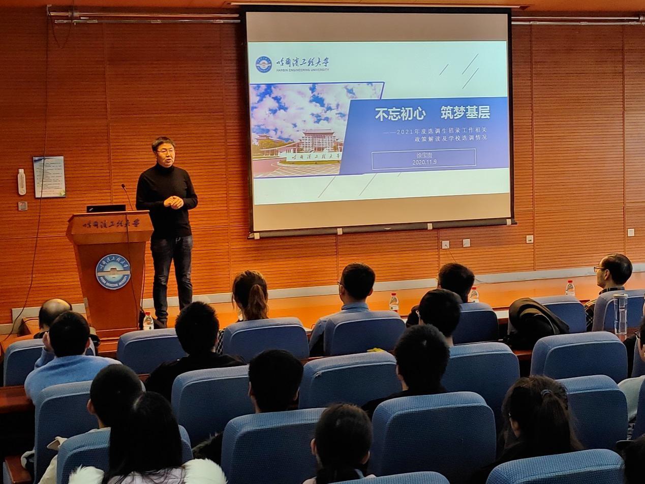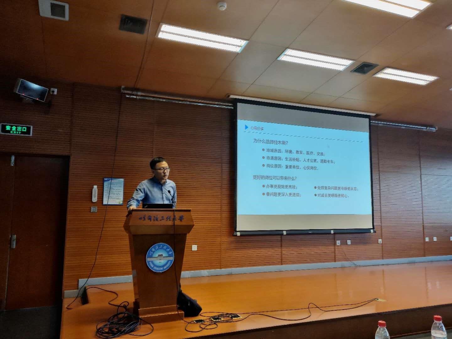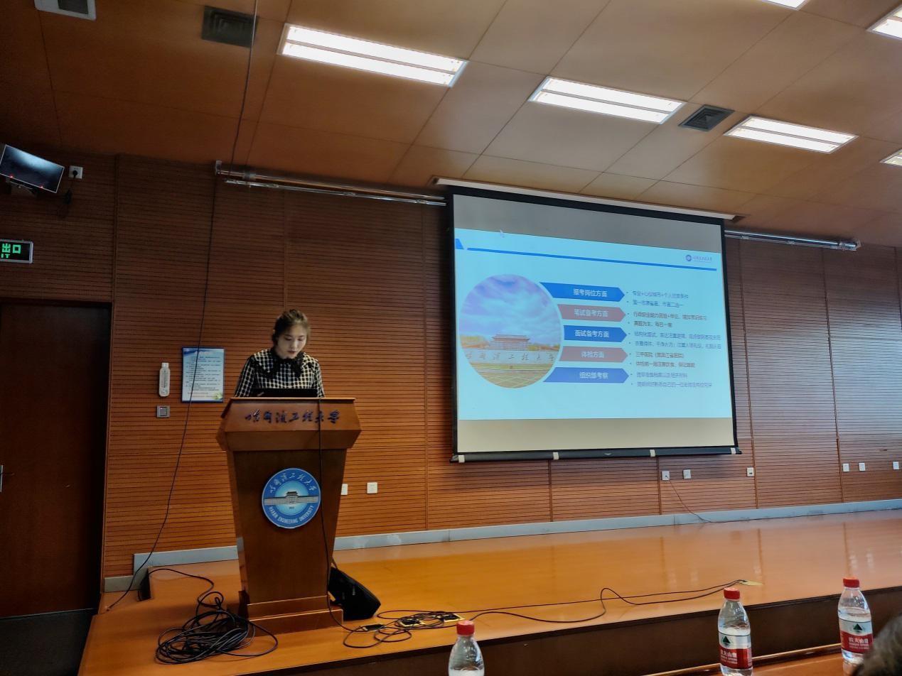 志愿服务活动中,徐宝贵同志向同学们做了选调生招录工作相关政策解读及学校选调情况介绍,李凯同志就选调生业务能力要求、考试能力要求等进行了讲解。省委军民融合办科员、2020届人文学院选调考生王文佳,佳木斯市委组织部科员、2020届材化学院选调考生嵇境晗,牡丹江市委自然资源局科员、2020届航建学院选调考生刘浩,就其考试心得、工作体会和同学们作了分享。