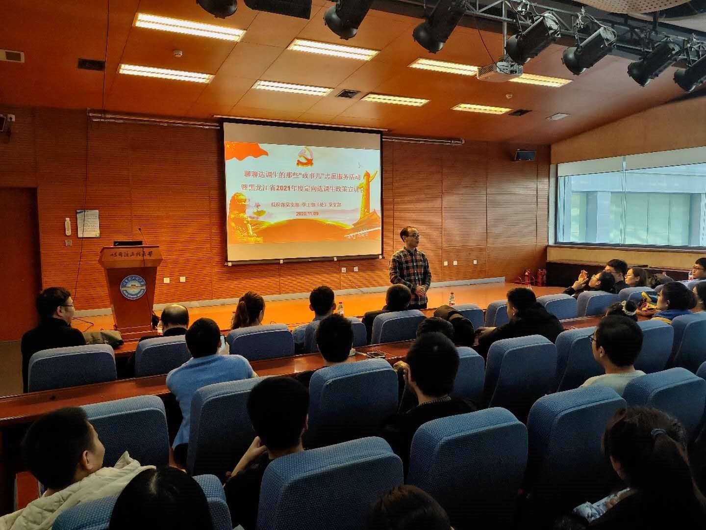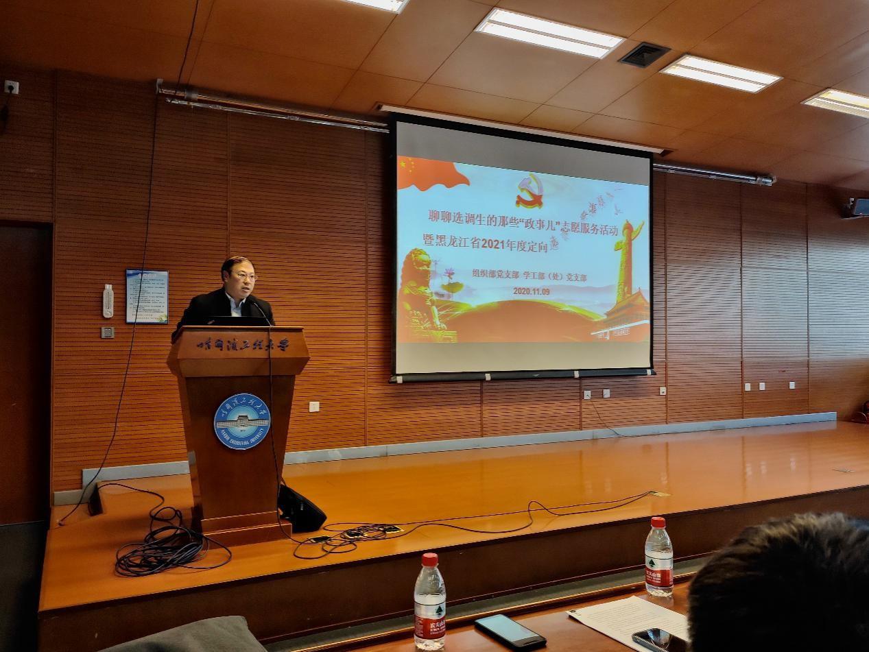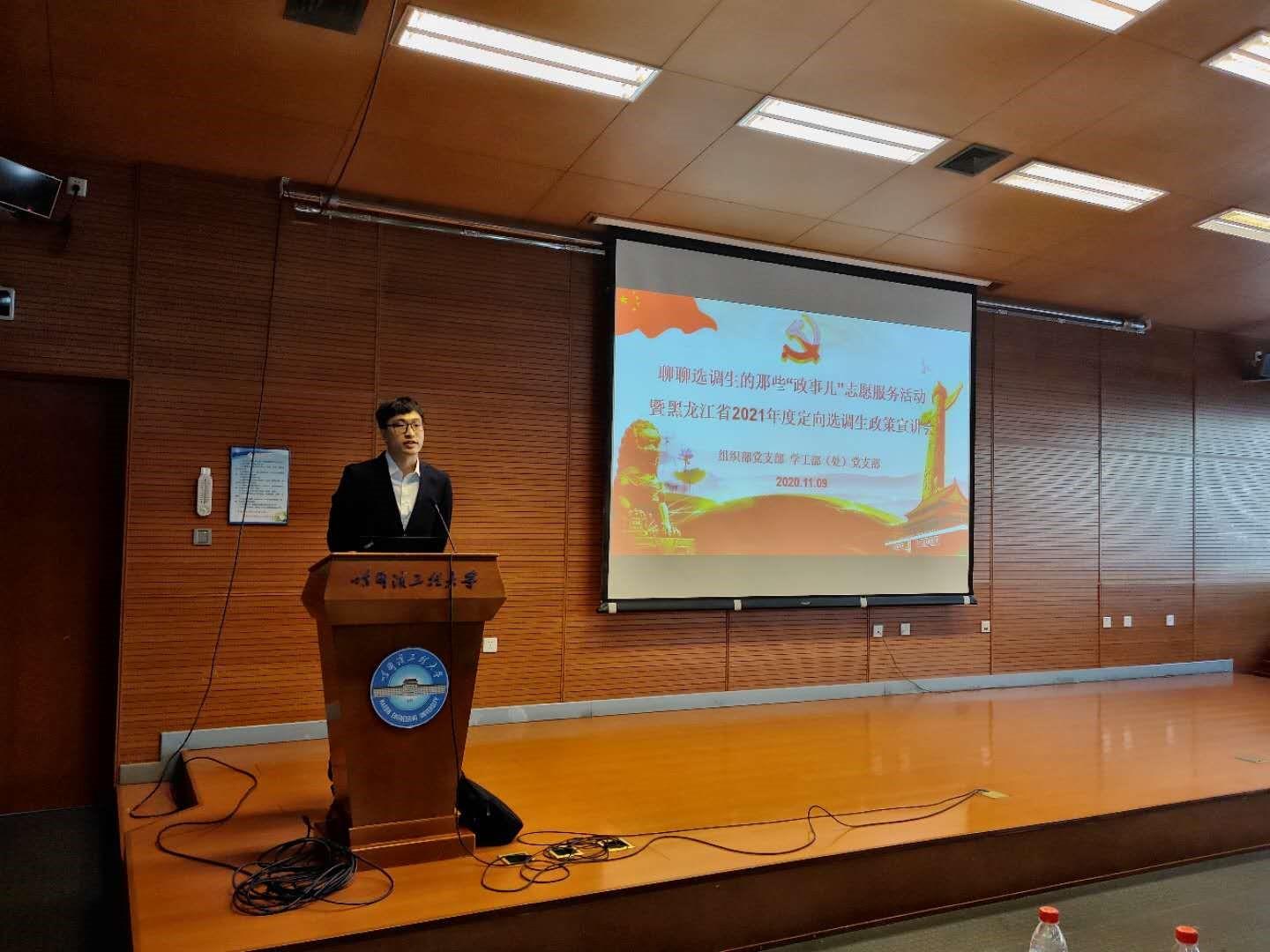 为贯彻落实学校党委关于加大黑龙江省定向选调生有关政策的宣传、引导和组织工作,11月9日中午,组织部党支部、学生工作部(处)党支部在启航活动中心学术报告厅联合开展“聊聊选调生的那些‘政事儿’”志愿服务活动。