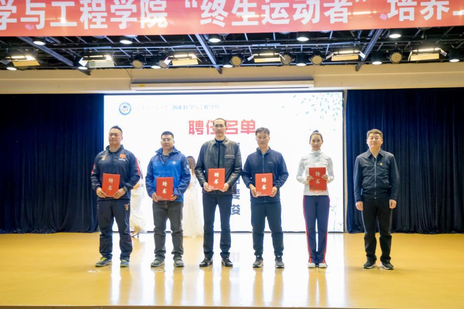 智能学院副书记徐宝贵宣读俱乐部指导教师聘任名单,随后由李洪波为俱乐部指导教师:校体育部健美操课程负责人庞博韬、校体育部足球课程负责人庞雪林、校体育部篮球课程负责人马杨、校体育部橄榄球课程负责人刘云斐、校体育部羽毛球教师杨俊颁发聘任证书。