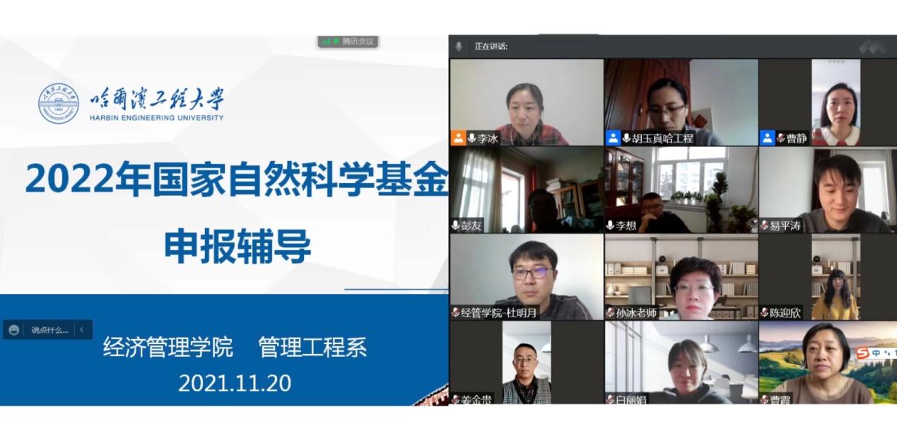 近日,经管学院管理工程系2022年国家自然科学基金项目申报辅导在线上开展,会议邀请北京化工大学李想教授、东北大学易平涛教授、哈尔滨工程大学孙冰和曹霞教授,为四位管理工程系教师的2022年国家自然科学基金申报书进行逐一指导。