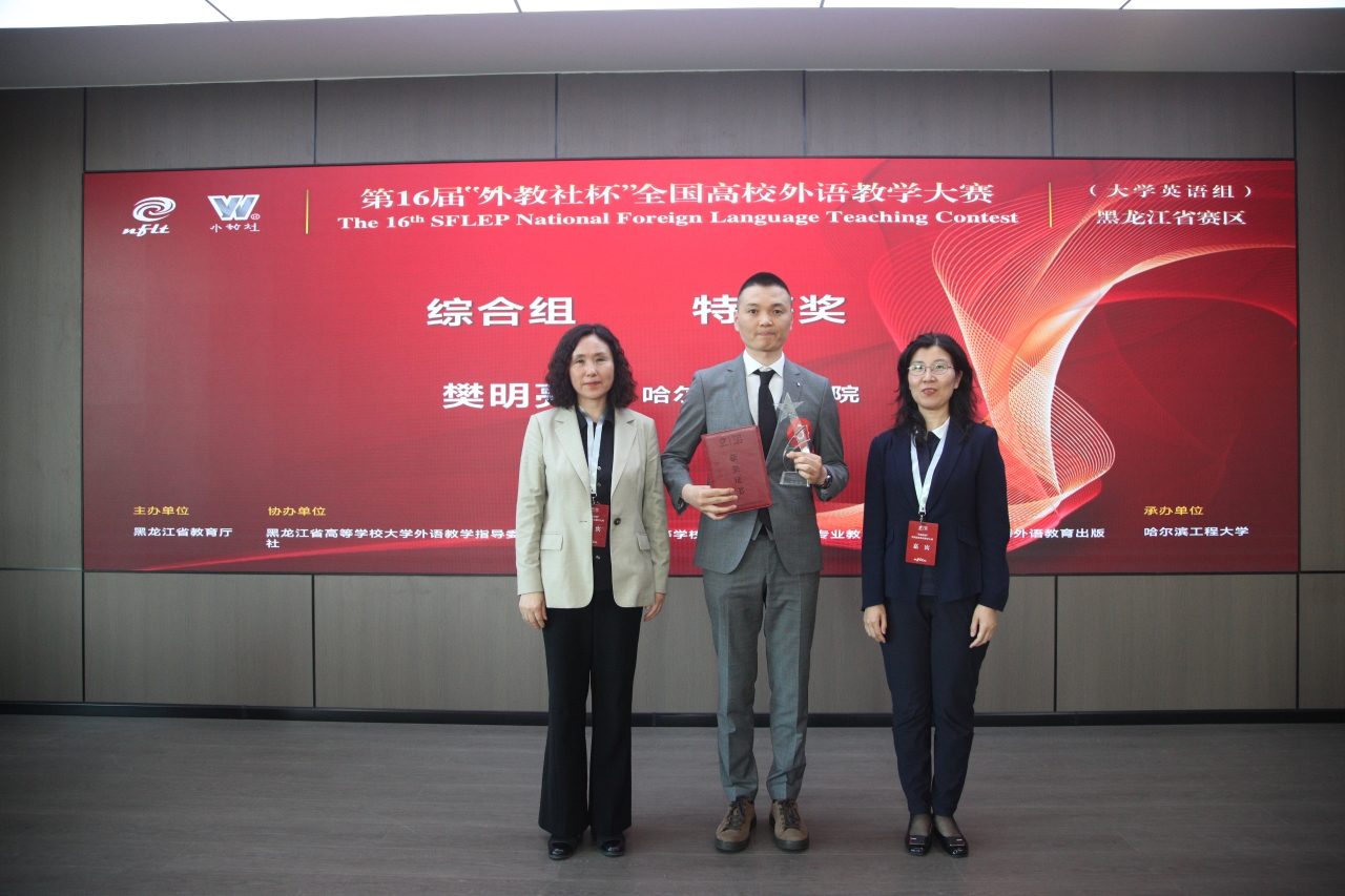 5月24日,第十六届“外教社杯”全国高校外语教学大赛黑龙江赛区决赛圆满落幕。本次大赛由黑龙江省教育厅主办,黑龙江省高等学校大学外语教学指导委员会、黑龙江省高等学校外国语言文学类专业教学指导委员会、上海外语教育出版社协办,我校承办。黑龙江省教育厅副厅长程爽,黑龙江省教育厅高等教育处处长雷永超,上海外语教育出版社副社长严凯,黑龙江省高等学校大学外语教学指导委员会主任委员、佳木斯大学副校长隋晓冰、哈尔滨工程大学党委副书记、纪委书记姚震出席颁奖典礼。