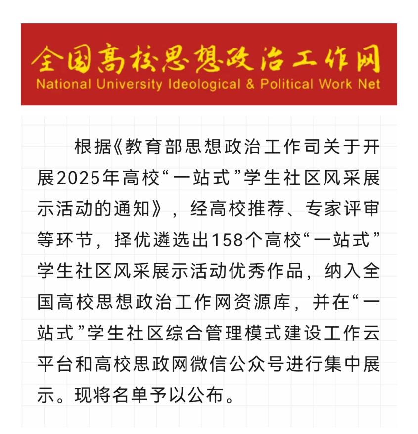 近日,教育部思想政治工作司发布了2025年高校“一站式”学生社区风采展示活动优秀成果评选推荐结果,我校组织申报的“党建引领”“文化建设”“条件保障”3项案例获评“优秀成果”。