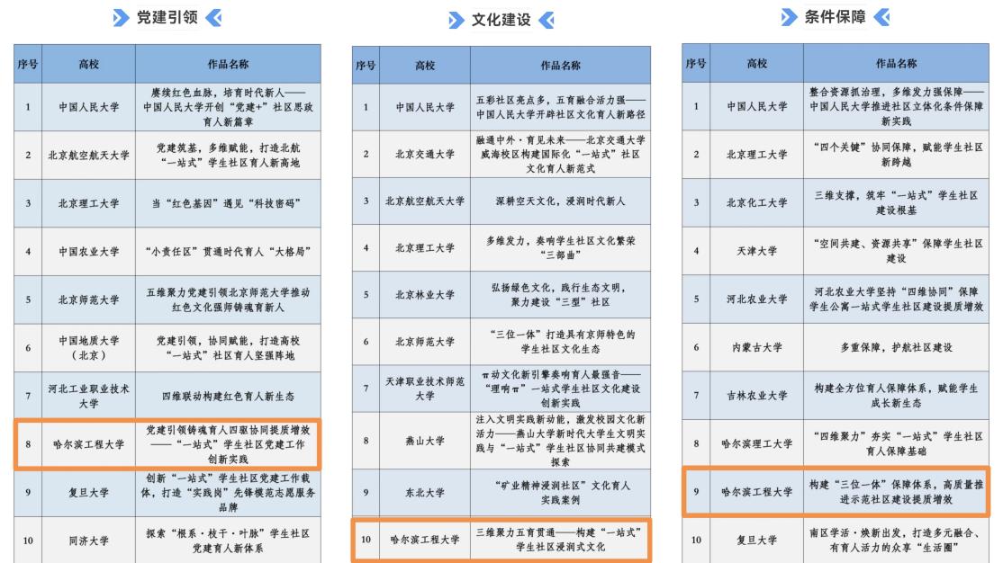 哈尔滨工程大学2024年12月获评黑龙江省首批“一站式”学生社区建设创新高校,2025年2月获评全国高校示范“一站式”学生社区。学校立足“五个坚持、五个注重”的办学原则,坚持“校园即社区,社区即课堂”核心建设理念,贯彻“一切为了学生成长”的办学理念,以“书院+学院”双轮驱动为主线,全面聚焦时代新人铸魂工程和拔尖创新人才培养,构建以五育并举为引领、三观养成为核心、三全育人为承载、四自教育为切入的社区育人新格局,以“四个强化”推进“一站式”学生社区建设提质增效。学校将以此为契机,持续建好全国高校一站式示范社区建设,优化服务流程,完善功能布局,全面提升管理育人和服务育人的综合实效。