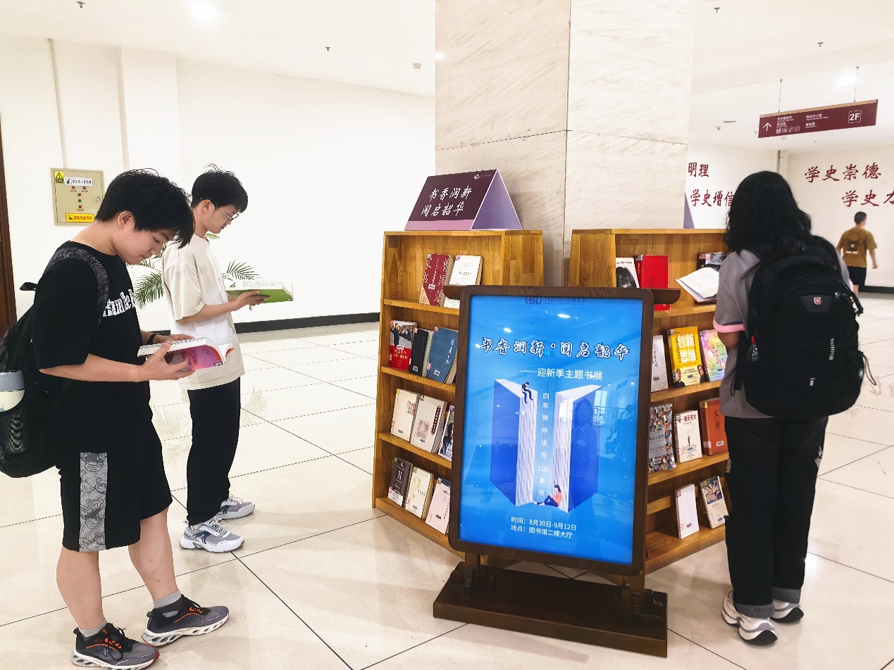 “新生书展”活动。书展以“书香润新・阅启韶华”为主题,汇聚文学、历史、哲学、科学、艺术等多个领域的获奖图书,兼具思想性与可读性,堪称新生的“大学阅读入门指南”。书展书籍支持“随展随借”,新生凭校园卡即可借到心仪图书,让书香伴随大学成长之旅。