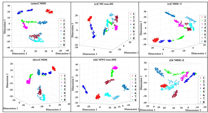 信息熵特征t-SNEk可视化分布情况,证明提出的信息熵方法有利于船舶故障特征分类识别