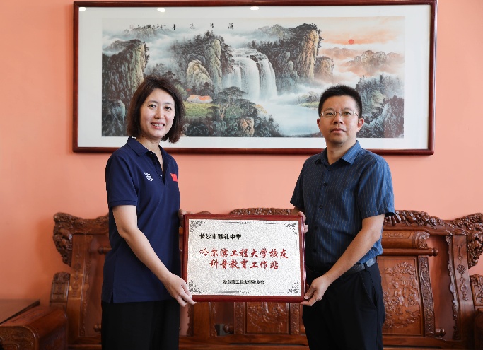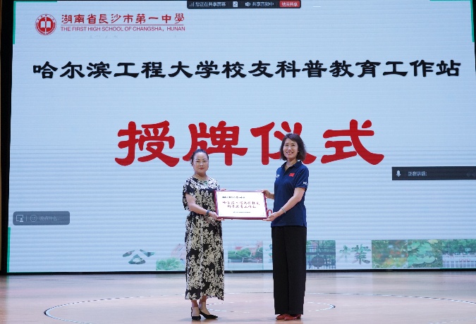 报告开场前,信通学院党委书记王锐向两所中学授予“哈尔滨工程大学校友科普教育工作站”牌匾。她表示,湖南是红色沃土,是学校前身哈军工首任院长陈赓大将的家乡,为学校输送了大批胸怀祖国、信念坚定、素质过硬的青年学子。工作站将以国防科普教育为纽带,让哈军工“想的是党、为的是国、强的是军”的精神内核与哈工程“三海一核”战略科技力量通过校友专家的讲述,更生动地走进中学生的视野,助力更多湖湘学子从黄河之畔、湘水之滨走向深蓝海洋,成长为担当民族复兴大任的时代新人。