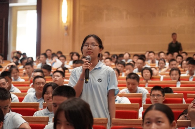 互动环节中,现场同学纷纷举手提问:“女生适合从事船舶科研吗?”田小川教授一一耐心解答,并向提出问题的同学们赠送了自己的最新著作《向海图强》。结合军训的特殊契机,她强调,“军训锤炼的是意志,而国防科技需要的是坚守。”希望同学们传承前辈们的坚守与奉献,用青春诠释好“中国造船 深蓝止戈”的时代内涵。
