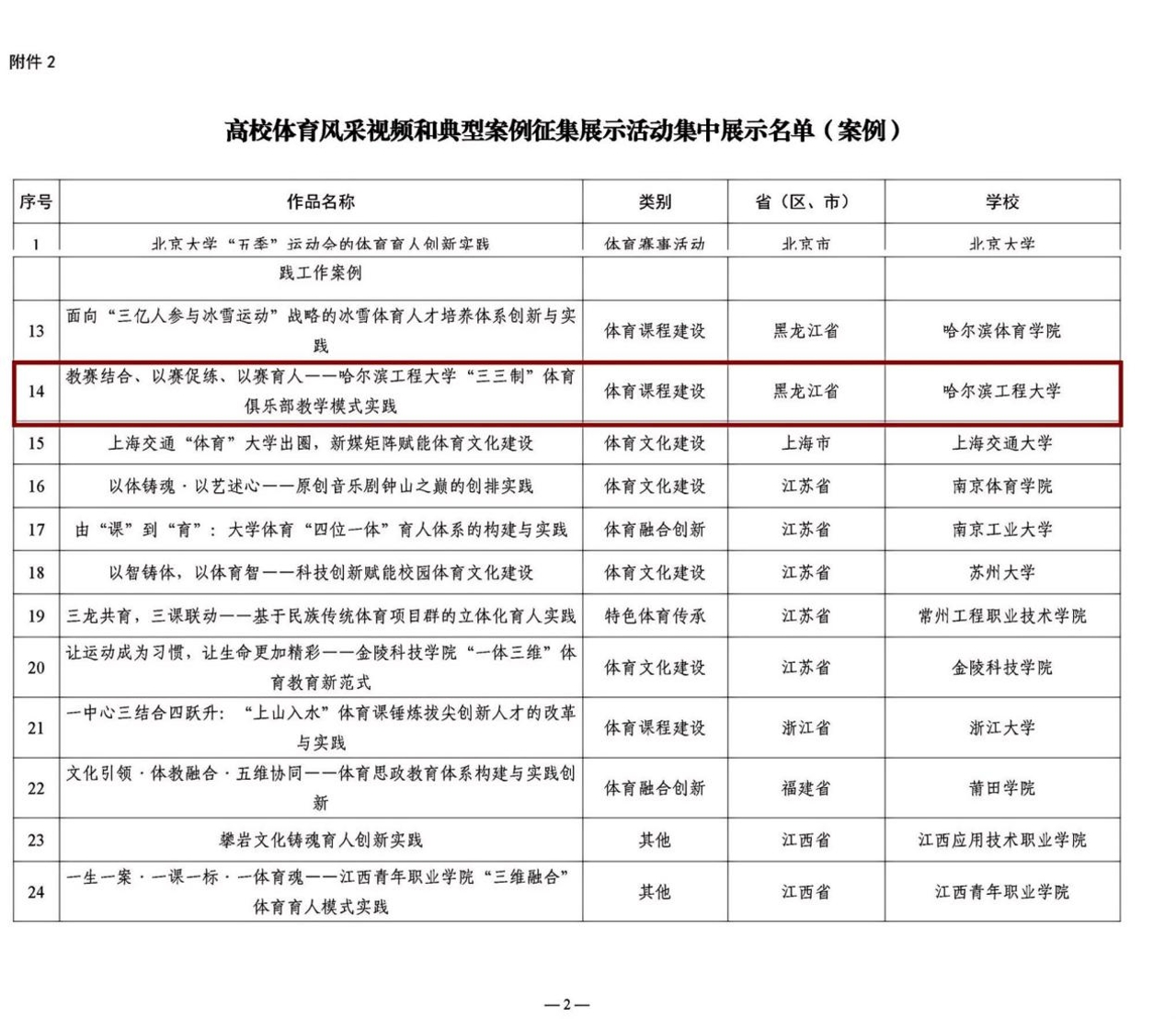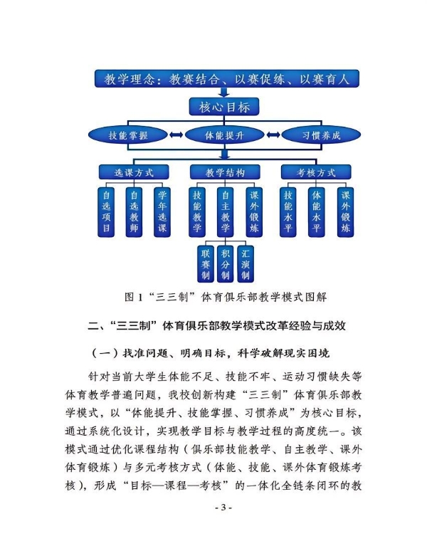 《教赛结合 以赛促练 以赛育人——哈尔滨工程大学“三三制”体育俱乐部教学模式实践》案例,系统展示了学校特色并长期实践的“三三制”体育俱乐部教学模式。该模式以“教赛结合、以赛促练、以赛育人”为核心理念,构建了涵盖选课方式、教学目标、教学内容、考核方式及自主教学组织形式在内的完整体系,旨在实现“技能掌握、体能提升、习惯养成”三大核心目标。通过科学设计“目标—课程—考核”一体化闭环教学体系,有效破解了高校体育教学中普遍存在的体能不足、技能不牢和运动习惯缺失等问题。创新采用“自选项目、自选教师、学年选课”机制,充分尊重学生主体性。同时,自主研发AI数智化体育平台,实现赛事智能管理、课外锻炼跟踪和体育社交互动,大幅提升了教学与管理效能。目前,该模式已覆盖20余个教学俱乐部,年均举办赛事与活动超1500场,参与学生上万人次,形成了如“蛟龙杯”、“飞龙杯”、“翼龙杯”等多项传统品牌赛事,学生体质健康及格率常年保持在90%以上。成果获教育部、省教育厅多项奖励与认可,多所高校来校进行实地调研,为全国高校体育教学改革提供了具有典型示范意义的“哈工程方案”。