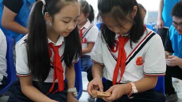 传统文化体验区,来自苏宁红军小学的孩子们化身"小工匠"制作竹制书签,在宋以国老师的指导下他们先用彩笔勾勒出浪花、舰船等海洋主题图案,并写下自己的寄语。一旁的激光雕刻机同步运作,科技与手工的碰撞让传统工艺焕发新彩。王沐宸同学说到:“很高兴能够来到哈尔滨工程大学参加星火科普行活动。作为一名少先队员,我知道了为船、为海、为国防是哈工程的理念,这也将成为我的理想。”