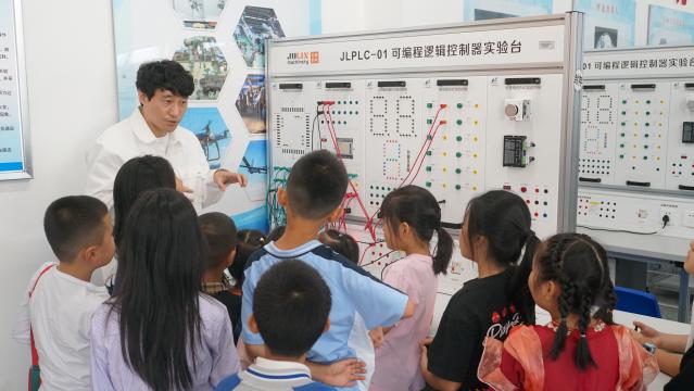 在PLC实验台前,明铭老师带领硕士研究生何威通过深海海工作业装备、城市交通信号控制模型,将抽象的自动控制理论形象化。通过观看编程修改信号周期直观感感受工业"神经中枢"是如何像大脑般指挥现代社会的有序运行。来自艺树幼儿园大班的侯盼兮感叹道:“原来我们每天经过的路口,竟然藏着这么多的智慧科技!”