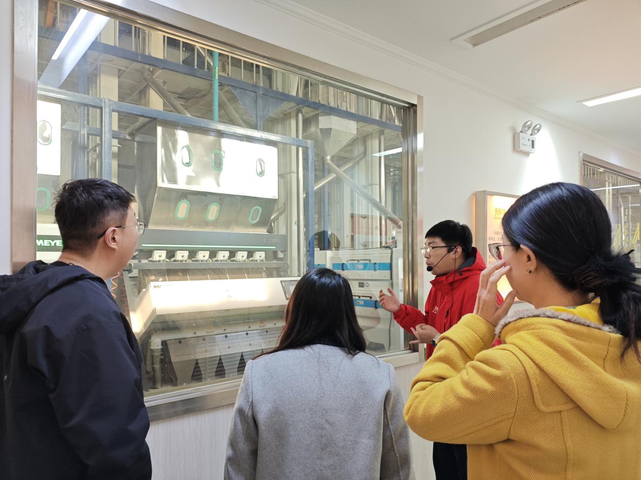 党支部党员师生走进生产车间,沿观光走廊实地观摩稻米自动化、智能化加工流程。精密色选、机械臂码垛等科技应用场景,正是落实党的二十届四中全会提出的“加快高水平科技自立自强,引领发展新质生产力”要求的具体体现,让大家切身感受到科技赋能传统农业、保障国家粮食安全的磅礴力量。