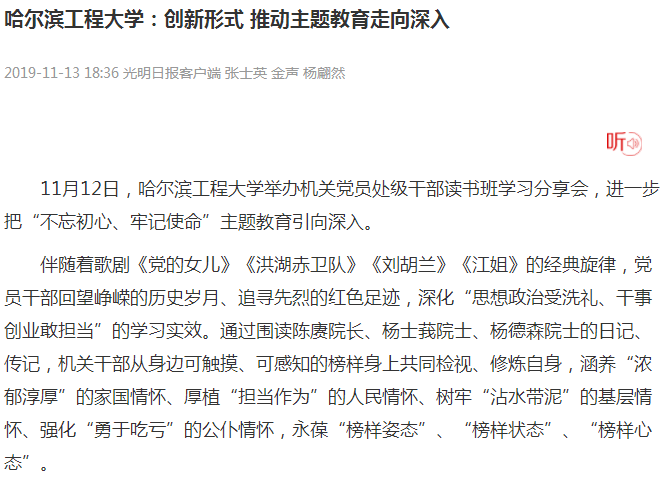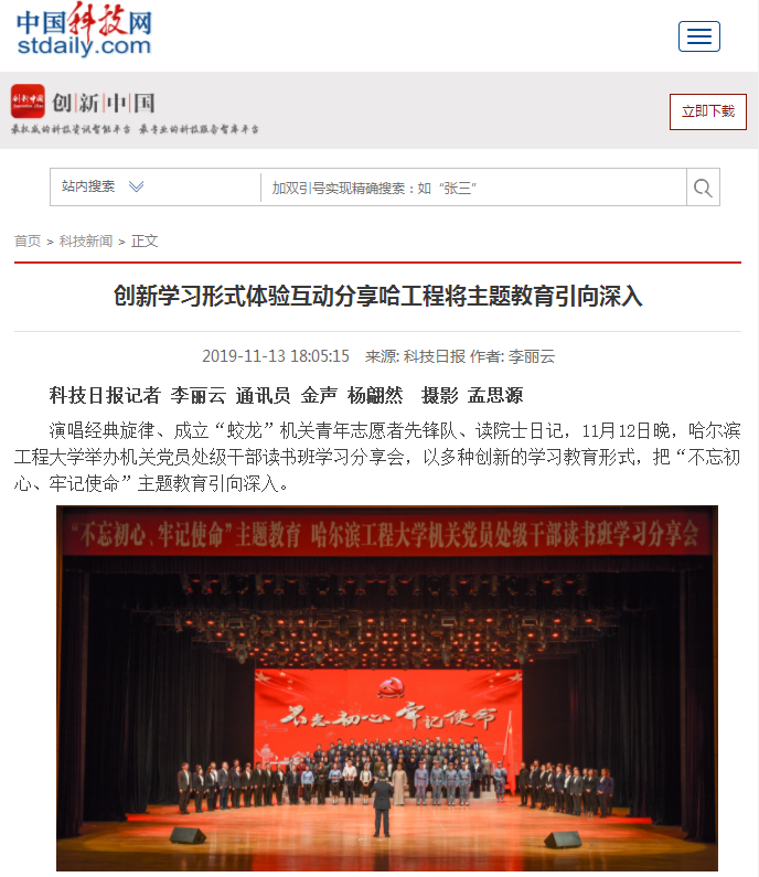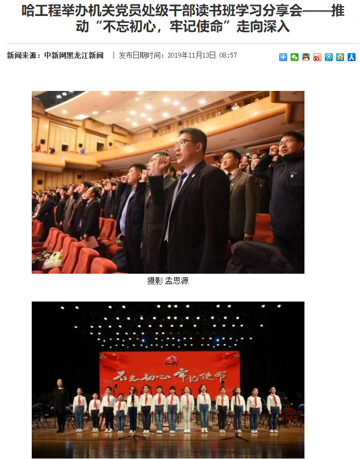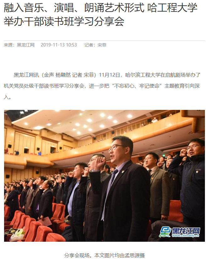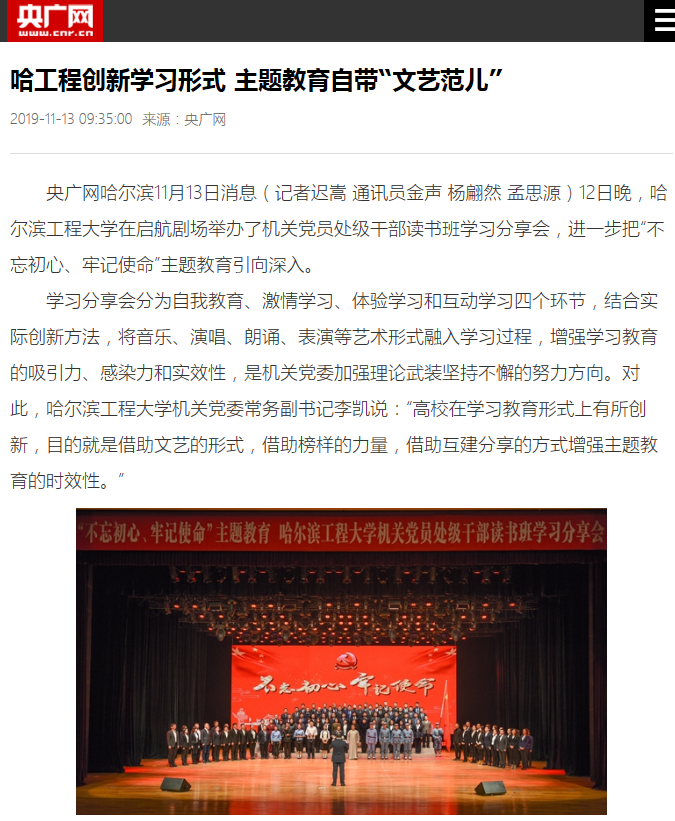 为贯彻党的十九大精神,将“不忘初心、牢记使命”主题教育引向深入,11月12日,哈工程机关党员处级干部读书班学习分享会于学校启航剧场举行,活动以其形式的创新性、内容的活跃性及教育的深刻性而受到国内多家媒体的关注。《光明网》《央广网》《中新社》《中国科技网》等网络媒体,以及哈尔滨电视台等地方媒体纷纷报道了这种新颖生动的学习形式。