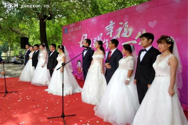 临近中午,6对新人在师长亲朋的见证下缓步走向舞台。为了让这些工科学子不至太拘谨,主持人让新人们玩起了游戏,播放一首曲子的开头,然后新人们抢答歌名。生龙活虎的哈工程小伙子们不负重望,每答必中,这可急坏了美女主持人。她说:“下一首一定要留给学姐们抢答哟。”可当下一首曲子响起时,一名新郎又快步抢走了麦克风。现场观礼嘉宾不约而同露出一丝失望,谁知,小伙子拿到麦克风并没有答题,而是暖心地将麦克风搬到自己爱人面前,请他的新娘来回答。现场爆发出掌声和欢笑。一个小伙子,因为抢答太多,直接被问当年是不是校园歌手;一个小伙子正在与新娘合猜歌名,另一个小伙子已抢先一步说出了答案。