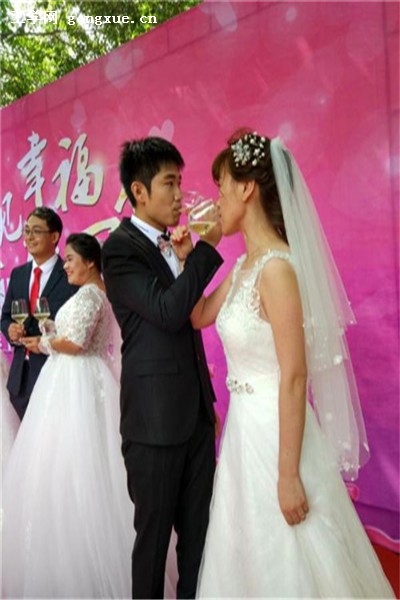 赠送信物环节,一名新郎单膝跪地,将戒指戴在自己新娘的手上。新娘一脸的幸福,与新郎共饮交杯美酒。宣读结婚誓词,模范夫妻教师代表于涛与姜虹为新人送寄语,校领导为新人颁发纪念证书。一场婚礼庄重热闹而又朴素大方。
