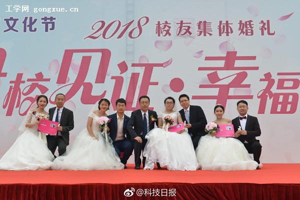 科技日报哈尔滨9月1日电(通讯员金声 记者李丽云/文 孟思源/摄影)9月1日,哈尔滨工程大学的32对校友,在学校65周年校庆当日,在母校的见证下结为伉俪。一位新娘因病坐在轮椅完成婚礼,合影环节,校长姚郁为了表示对她的尊重与祝福,单膝跪地,保持与她同样的高度。其他新郎新娘也都单膝跪地。观礼嘉宾掌声雷动,热泪盈眶者众。